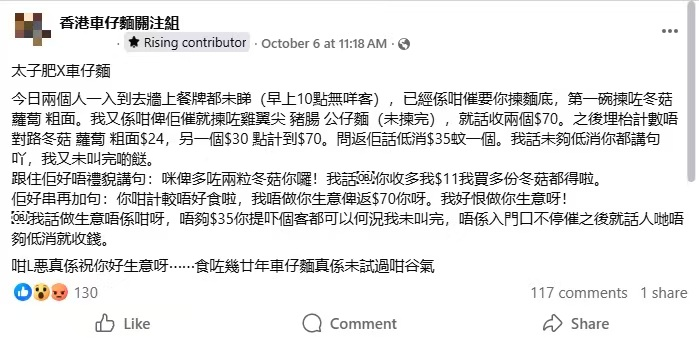 这样的服务体验让自己 “食咗几廿年车仔麵真係未试过咁谷气”(吃了几十年车仔面,从没这么气过)。