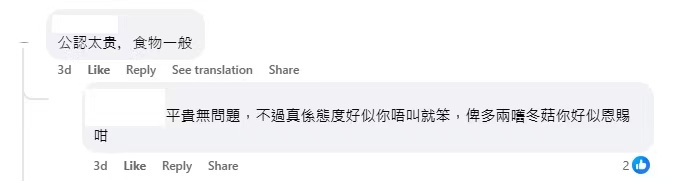 面对网友评论,食客也补充回复:“平贵无问题,不过真係态度好似你唔叫就笨”(价格高低没问题,但态度真的像是 “你不消费就是傻” 一样)。