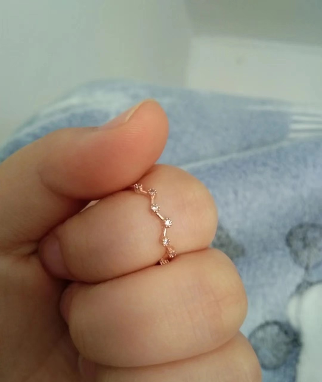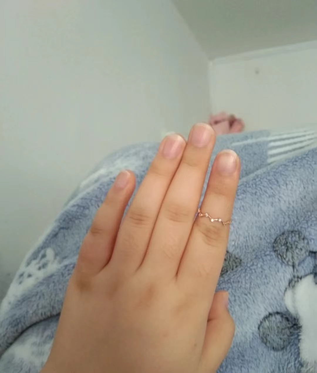 买戒指的时候,戴成这个亚子,老板阿姨说现在流行这种。这个号数是17,给拇指发了个紧箍。买的时候闪得不灵不灵的,是钻石小吗