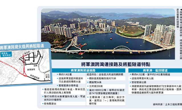 全港首条同时设有行车道、行人路、单车径及观景台的将军澳跨湾连接路(跨湾大桥),以及将军澳│蓝田隧道工程踏入最后阶段! 据了解,两个项目暂定下月11日通车,繁忙时间往来将军澳和东九龙,车程料可节省20分钟。