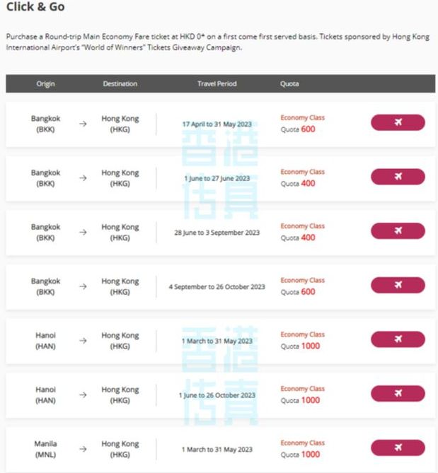 另一家航空——香港航空,以先到先得的方式进行抢票,同一航线也有不同的时间段可以选择,比如曼谷往返香港的免费票,有4月17日至5月31日期间的、6月1日至6月27日期间的,以及6月28日至9月3日之间的: