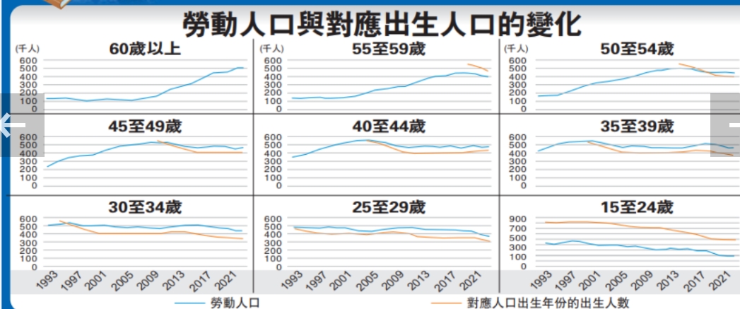 若将各年龄组别的劳动人口数据,与其对应出生年份的出生人数比对,当可发现存在极大关联性。譬如55至59岁群组的劳动人口,于2019年见顶回落,正因他们出生的60年代出生人口亦告下跌;同一影响,也见诸50至54岁群组的劳动人口于2014年见顶,45至49岁的则于2009年见顶……后来出生人口再降,尤其80年代和90年代再跌一轮,自然连累对应的年轻劳动人口骤减,只是影响滞后浮现。至于中间颇长时间, 由于对应的出生数字持平,故劳动人口同步持平。