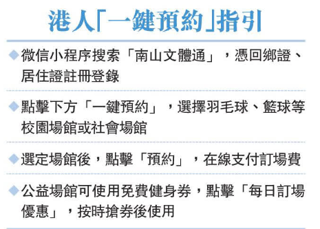 港人在深圳体育健身也能享免费订场优惠了,可与内地居民同等待遇。近日,深圳市南山区启动了2023南山体育消费季活动,通过发放免费体育消费券,策划水上运动、冰雪运动等10馀个特色专项活动,推进全民健身运动。为进一步促进深港融合,活动首次设置香港专项,港人可跨越深圳湾,通过“一键预约”平台来参与南山公益文化体育活动,在线可预约的体育场馆达148家。同时,港人还可参与文化演出免费抢票和补贴购票等活动,进一步丰富业馀文化生活。香港文汇报记者了解到,前两届体育消费季活动因疫情等并未开放给港人参与,此次是首次向在深居住港人及在港居住的香港市民开放。