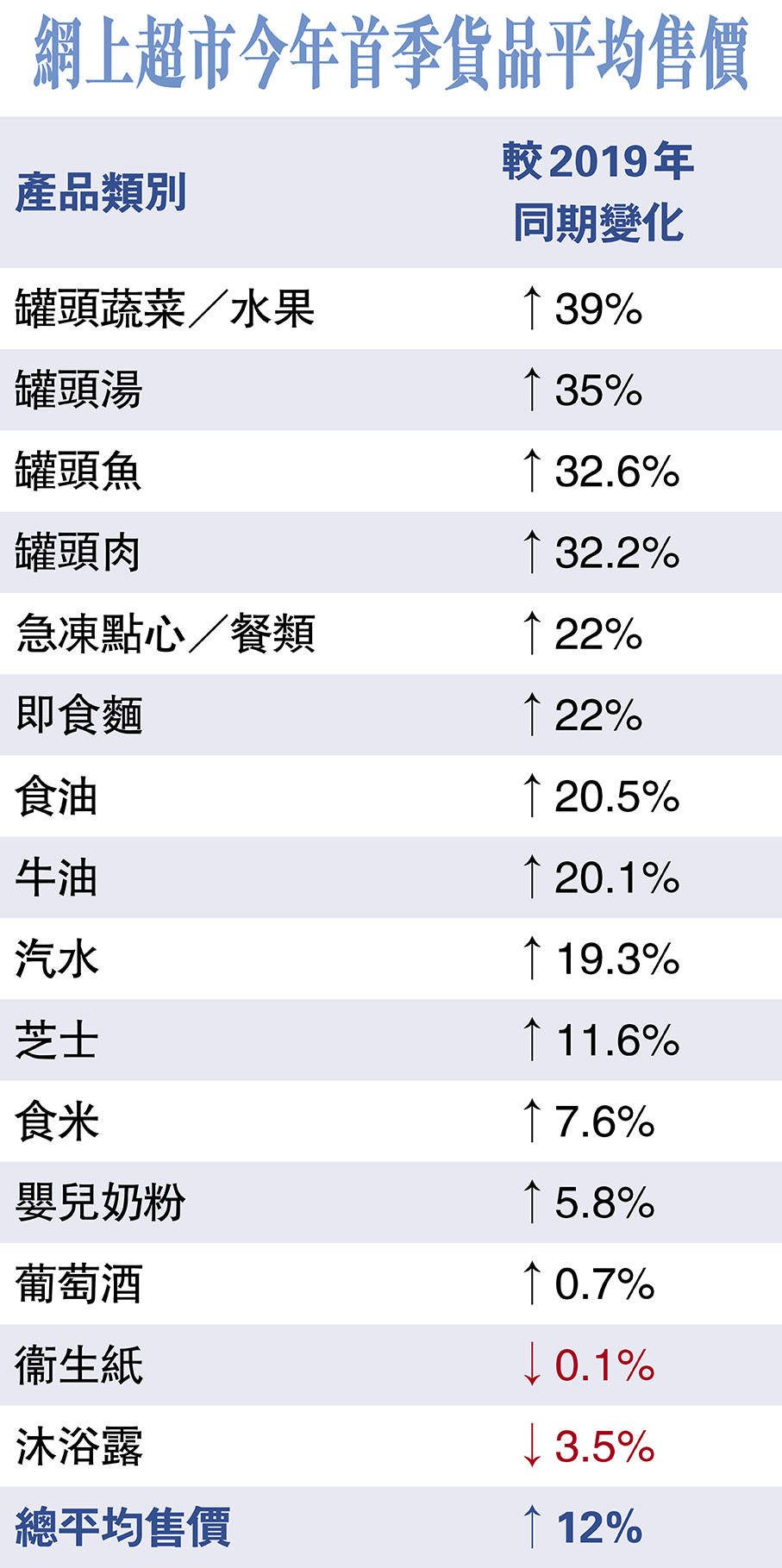 香港经济仍未完全复甦,物价却抢先加价,令市民生活百上加斤。消委会昨日公布超市价格调查,发现三大超市去年260项货品的总平均售价按年上升2.1%,加幅高于通胀;升势更延至今年,网上超市的各类罐头今年首季较疫情前加价逾三成,其中罐头蔬菜或水果,以及一款食油比疫情前加价近四成。消委会形容升幅惊人,并提醒随着电子消费券派发,一些“假着数”涌现,市民要货比三家,小心格价。民建联“超市价格关注组”亦发现超市趁消费券派发之机推高物价,呼吁商界与市民共渡时艰。消委会《选择》月刊昨日公布,3间大型连锁超市AEON、百佳及惠康的电子扫描数据,发现260项货品的去年总平均售价较2021年平均上升2.1%,高于同期的综合消费物价指数1.9%的升幅,亦是自2013年以来录得的最大升幅。当中,13大类货品中有10类录得1.7%至5.4%升幅,以“粮油食品”升幅最大,其次是“杂粮/调味”、“罐头食品”和“即冲饮品”。