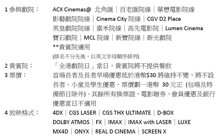 香港戏院商会早前表示,本周六全港所有商业戏院票价一律港币30元,包场及特备节目除外。当日将不设长者、小童及学生优惠,其余所有换票证、电影赠券、会员优惠及银行优惠当日不适用。至于长者首场及长者早场优惠如低于30元,则维持不变。