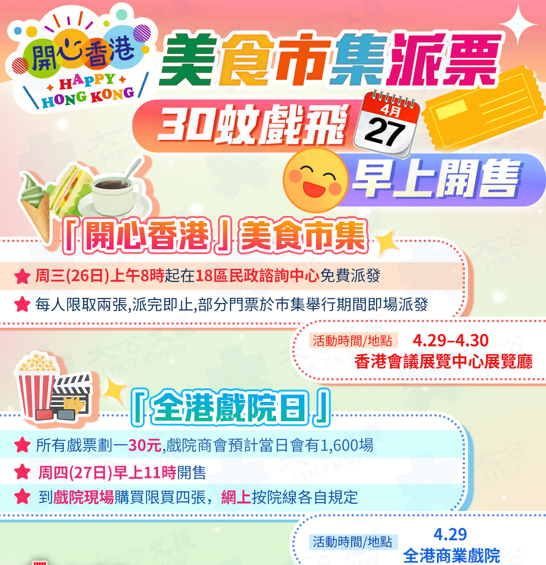 开心香港”系列活动由本周末打响头炮,市民可于本周六(29日)以30元优惠价,到全港任何戏院,欣赏上映中任何放映格式的电影。活动当日的戏票将于今日上午11时起,陆续于各大戏院票房及网上售票网页公开发售。戏院票房每人每次最多只可购买4张戏票,网上购票则依各院线的购票限制为准。