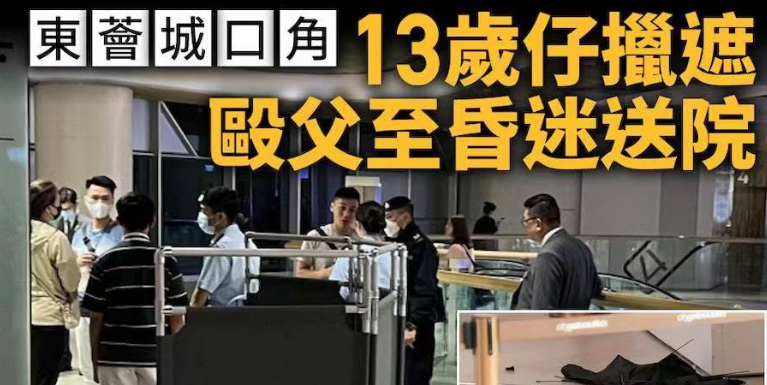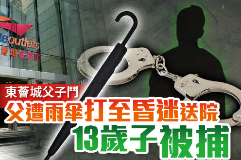 香港东涌昨天(7日)就有一名13岁男童竟以雨伞殴打父亲,导致对方昏迷! 事发在昨天晚上约7时,该名13岁姓许的男童与父母一家四口于东荟城逛街。 4人行至4楼一间服饰店外,男童疑因乱挥雨伞,遭父亲责骂。 双方初时口角,男童突然情绪激动,以雨伞痛击父亲头部及手部。 父亲被打至头部受伤,有约两厘米伤口,手肘亦受伤,他倒卧地上昏迷不醒。