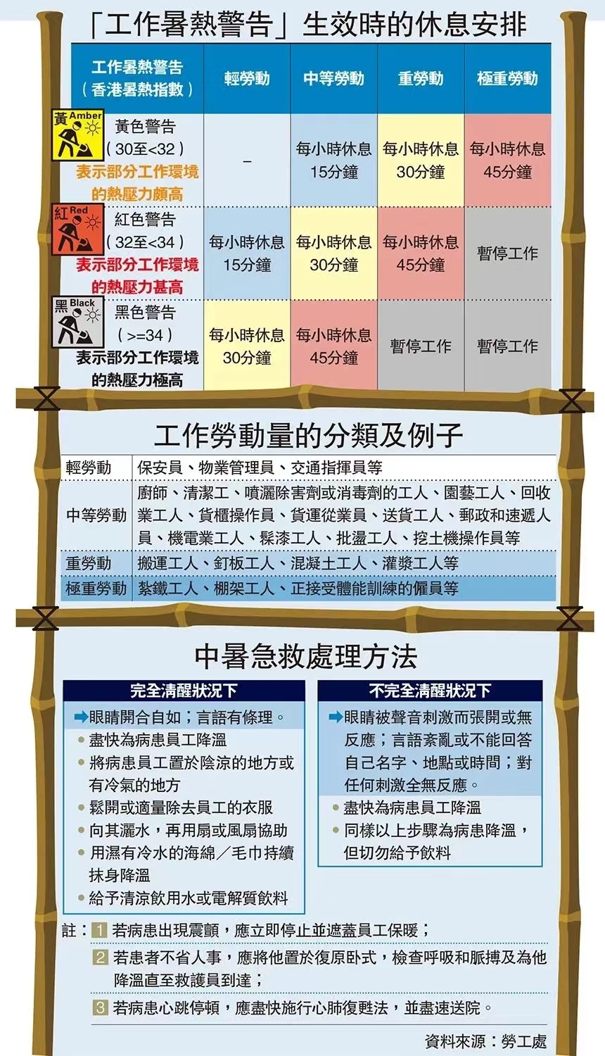 劳工处下周一起推行新的《预防工作时中暑指引》。在新指引下,当黑色工作暑热警告生效时,极重劳动的雇员需暂停工作。