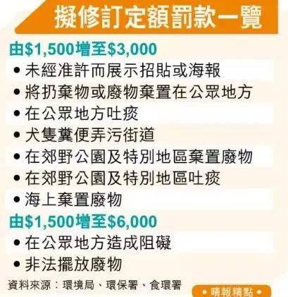 涉及在公众地方、郊野公园或海上弃置废物和吐痰等行为的七项表列罪行定额罚款金额由1500元增至3000元;店铺阻街和非法弃置建筑或大量其他废物的两项表列罪行定额罚款金额则由1500元增至6000元。
