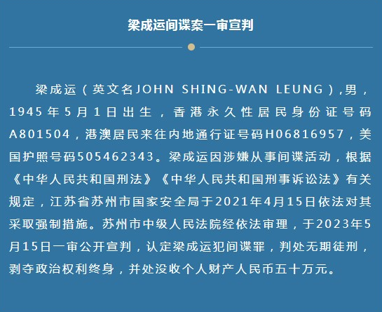 香港78岁男子梁成运涉嫌从事间谍活动,苏州市中级人民法院经依法审理,一审罪成,判处无期徒刑。