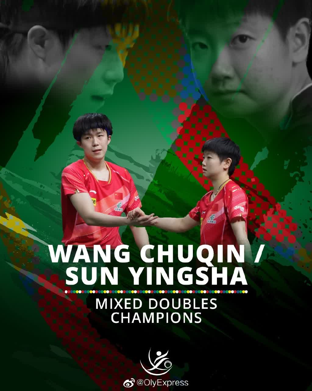 5月26日,世乒赛产生首个冠军。在混双决赛中,上届冠军中国组合王楚钦/孙颖莎仅用时33分钟就以3-0(11-6/11-2/11-7)再胜上届亚军日本选手张本智和/早田希娜,成功卫冕并实现国乒对赫杜塞克盃的三连冠。这也是中国第21.5个世乒赛混双冠军(2015年许昕和韩国梁夏银夺冠,各算半个)。