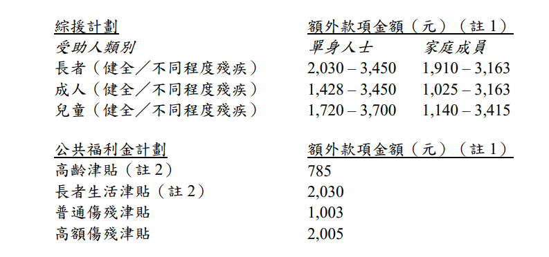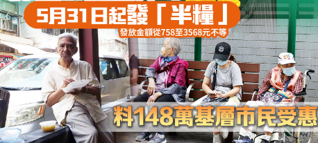 特区政府(5月31日)公布,按2022至23年度《财政预算案》建议,即日起向社会保障金额及职津人士,发放一次过额外款项,金额相当于半个月的综合社会保障援助标准金额、高龄津贴、长者生活津贴或伤残津贴。发放金额从758至3568元不等,预计163万名社会保障受助人,及7万个领取职津的住户可受惠,共涉及超过28亿元。