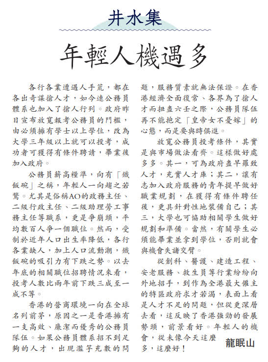 从创科、医护、建造工程、安老服务、救生员等行业纷纷向外地招手,到作为全港最大僱主的特区政府求才若渴,表面上看是人才不足的问题,但从更深层去看,这反映了香港强劲的发展势头,前景看好。年轻人的机会,从未像今天这麽多,这麽好!