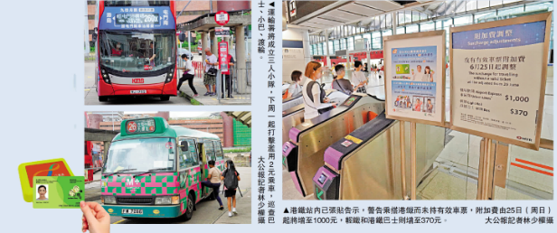 港铁由明日起提高罚款额,重铁罚款增一倍至1000元,轻铁及港铁巴士由290元增至370元。城巴新巴、九巴及龙运和香港电车都表示,会配合政府打击违规个案。有立法会议员关注,大型巡查行动不包括港铁,只靠港铁提高违规罚款,作用有限,建议运输署派员支援港铁执法。