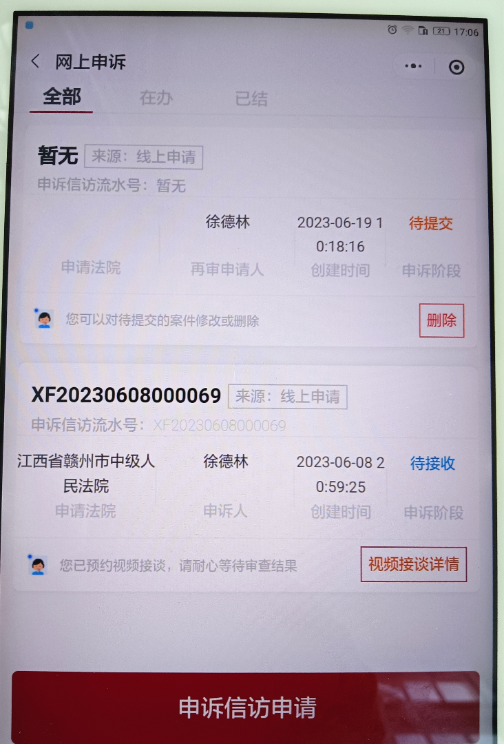 事情经过:笔者于2023年6月8日20:59:25时以小程序人民法院在线服务江西向江西省赣州市中级人民法院提交网上申诉申请,申诉信访流水号为:XF20230608000069,然而人民法院在线服务平台在2023年6月19日10:18:16时反馈却变成了申诉信访流水号“暂无”,如下图所示: