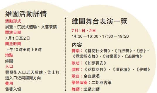 穿华服、化唐妆、品唐文创、赏唐风演出……在以「遇见长安看见中国」为主题的西安展区内,市民不妨到「常乐坊」的华服体验区,这里精选了近150套唐服供市民试穿,再到「兴庆坊」的华服集中展示区,观赏完美呈现的唐衣、唐纹及唐妆,之后到「永和坊」的唐三彩文创区,参观唐三彩博物馆、大唐不夜城文创、有何名唐文创等,最后到「安仁坊」的唐文化体验区,在游戏中体验古人生活文化的气息。当地艺术团体以舞动香江唐风主题作演出,让市民沉浸在香江唐风中。