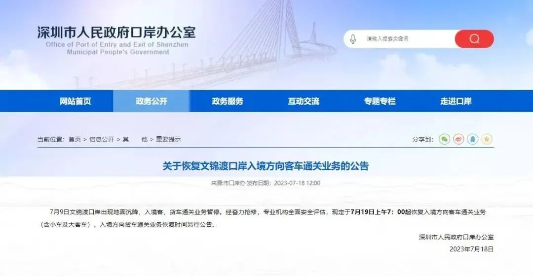 7月9日,文锦渡口岸出现地面沉降,为确保入境车辆安全,经省有关部门同意,暂停文锦渡口岸入境客、货车通关业务。