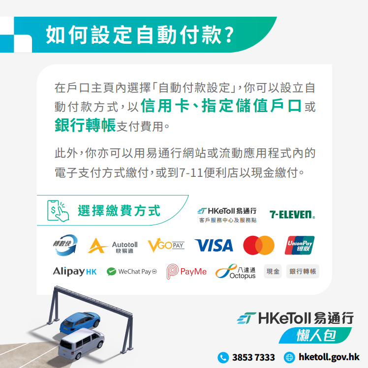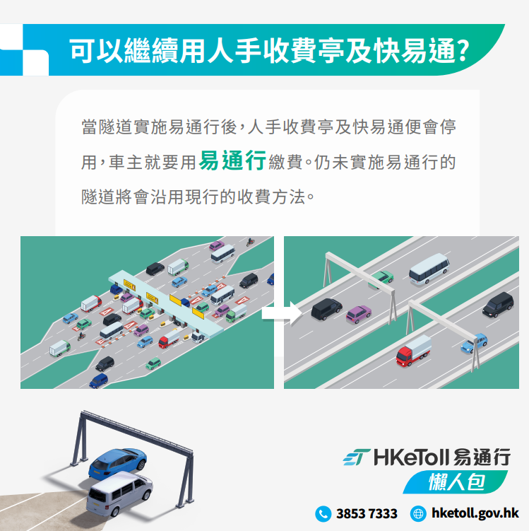 “易通行(HKeToll)”为运输署旗下,由快易通营运的不停车缴费系统,主要由“易通行收费系统”及“缴费贴”两部分组成的智慧出行措施。“易通行”有四大优点,包括无须停车、无须月费、无须转线,亦可支援多种付款方式。