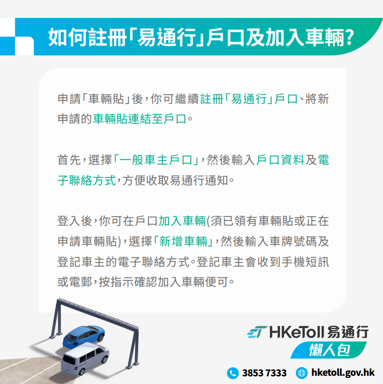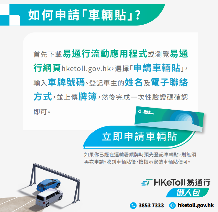 车主将“易通行”车辆缴费贴贴于车辆挡风玻璃上,当车辆经过易通行系统的龙门架装置,通过无线射频识别技术(RFID)及自动车牌识别技术,辨识车辆登记号码,系统会自动于预设的缴费户口中扣除隧道费,车辆无需在收费亭停车或经过“快易通”行车道,便可以“缴费贴”遥距缴付隧道费。自2021年11月1日起,车主只要到运输署牌照事务处登记并递交与车辆有关的申请,就可以同时选择申请“车辆贴”,申请将会自动转交隧道费服务供应商办理,之后会将车辆贴以邮寄方式寄到登记车主在运输署登记的地址,收到车贴后需要到“易通行”官网登记车辆资料。