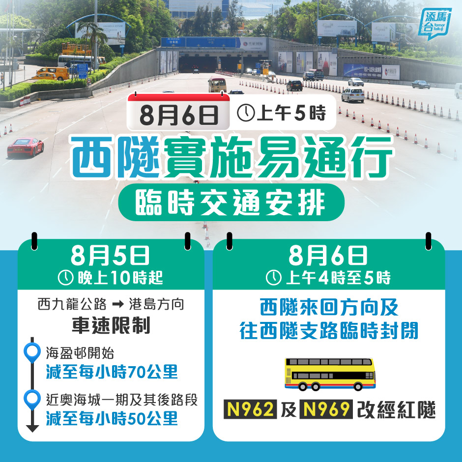 西九龙公路往港岛方向的车速限制,会由海盈邨开始减速至每小时70公里,近奥海城一期及其后路段亦将减至每小时50公里。西隧来回方向及往西隧的支路将在明日上午4时至5时临时封闭一小时。