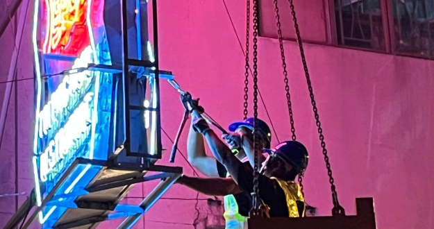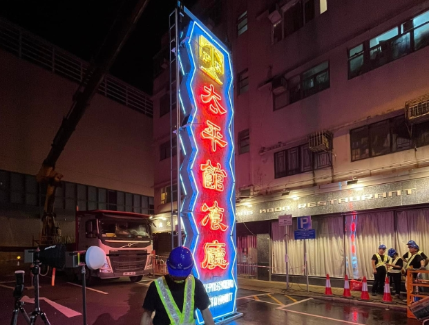 惟因应屋宇署“小型工程监管制度”,该招牌最终不获署方批准保留,直至昨晚由建筑工人拆卸下架。“太平馆餐厅”第五代传人徐锡安与霓虹保育机构“霓虹交滙”负责人,亦在场见证。