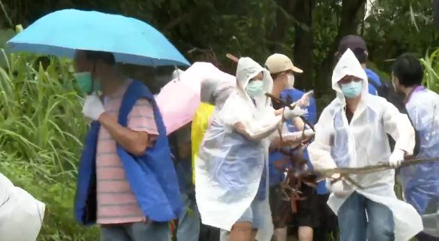 来自衞生署及环保署的政府人员穿上写有“政府应急队”字样的背心,他们戴上手套,分成两组将村内部分位置的塌树及树枝清走。