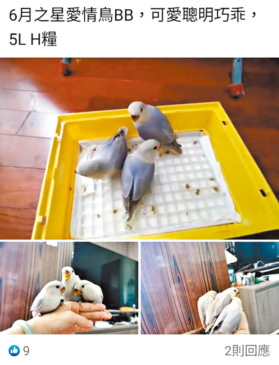 “爱情鸟BB,人手喂大,有兴趣欢迎交流”、“好可爱的爱情鸟BB,等家长来接放学,有意可PM”、“本地繁殖爱情鸟,保证健康,500粒粮”……这些公然出售自家繁殖鹦鹉的帖文近日涌现社交媒体,部分“自繁者”明知无牌买卖鹦鹉属违法,放售时只敢以暗语“雀粮”暗示交易金额,不过有买雀仔经验的人都心知肚明,“500粒粮”是“500大元”的意思。