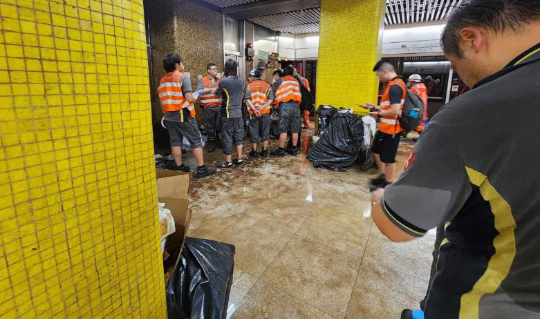 至于曾经被黄泥水浸没顶的地库层仍未解封,目前以白色帆布围封。黄大仙港铁站连接北馆的出入口,暂时未见加强防范水浸措施,但在出入口附近堆放数十个沙包备用。月台层有部分扶手电梯仍在复修,需要围封暂停使用,地面则摆放多个储水桶。