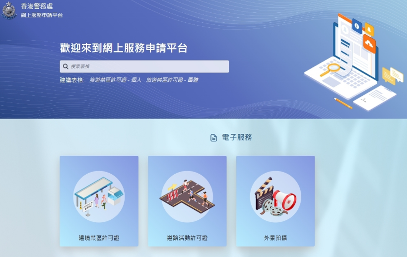 为达致全面电子化的目标,警务处上月斥资2000万推出“香港警务处网上服务平台”,首阶段让市民在网上申请边境禁区许可证、道路活动许可证以及外景拍摄等三个服务。市民可在网上填写表格,递交申请所需文件,查看申请进度等。