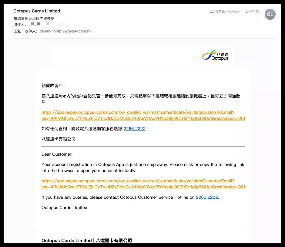 6⃣️输入验证码后,八达通app会发送邮件到你的邮箱,点击邮件中的链接,进行激活,就大功告成了。