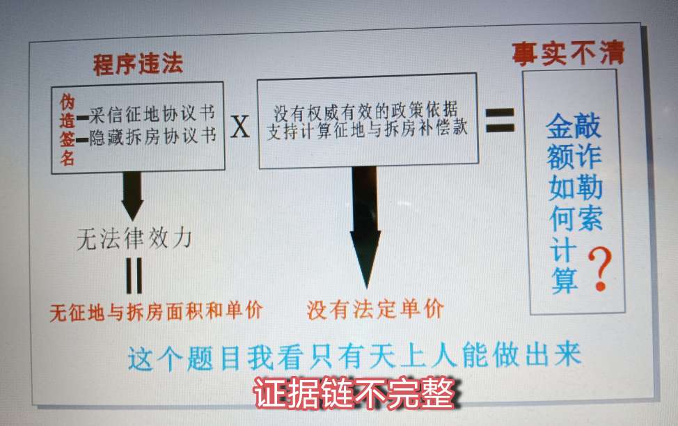 大伙不妨想想,其一,征地与拆房协议书签名都是伪造的,然而伪造签名的协议书是没法律效力的,因为面积和单价这些都应是写在协议书中的,结果这协议书签名被伪造,法官大人,请问这补偿款还怎么计算?其二,无论征地与拆房均拿不出权威有效的政策依据支持计算补偿款,这就说明没有标准单价,法官大人,请问没有单价的这道算术题你们是怎么算出敲诈勒索金额的?其三,无论一审二审和再审均未对网帖内容是否涉法确认,请问这敲诈勒索罪的构成要件(威胁、要胁或恐吓)从何认定?