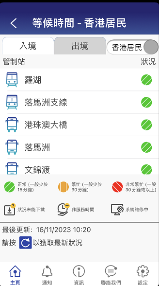 出入境口岸的实时状况每隔15分钟更新一次,亦可自行刷新,用户可自选“香港居民”或“访港旅客”进行查看。等候状况分为正常、繁忙及非常繁忙三个等级。当状况显示绿色,代表人流客量正常,等候时间一般少于15分钟;状况显示为黄色则代表口岸繁忙,等候时间一般少于30分钟;当显示为红色,即代表口岸非常繁忙,等候时间需30分钟或以上。