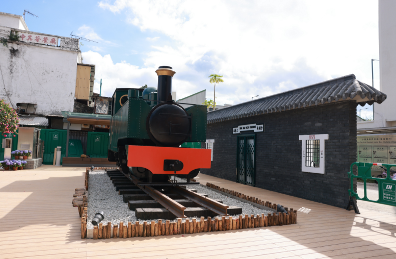 中英街花园内一个模仿香港旧式火车站及一比一的火车头。(政府新闻处)