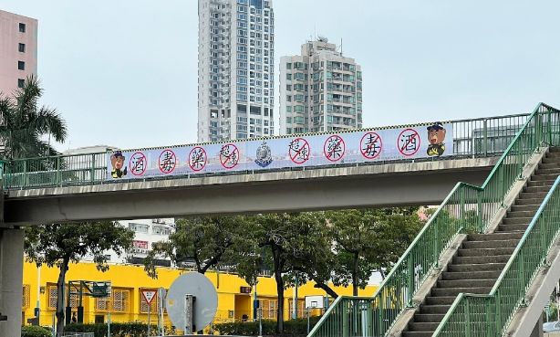 随着圣诞佳节及新年临近,香港警方已于15日起,在窝打老道、龙翔道、东九龙走廊等出入西九龙区主要干道的行人天桥上悬挂大型横额,提醒司机切勿药后、酒后或超速驾驶。