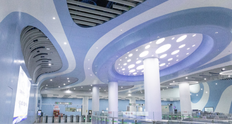 该线路工程设计以“山海如画,筑梦远航”为主题,遵循“阳光+”的核心定位,营造“漫游山海”的浪漫氛围。大梅沙站是唯一的“特色站”,有“深海之光”的美誉,站内充满了多元繁丽的海洋元素,营造了浓厚的海洋艺术氛围。车站牆面以不同深浅度的蓝白色面板为主要饰面,阳光透过天窗缓缓洒下,牆面的海浪立刻变得波光粼粼。