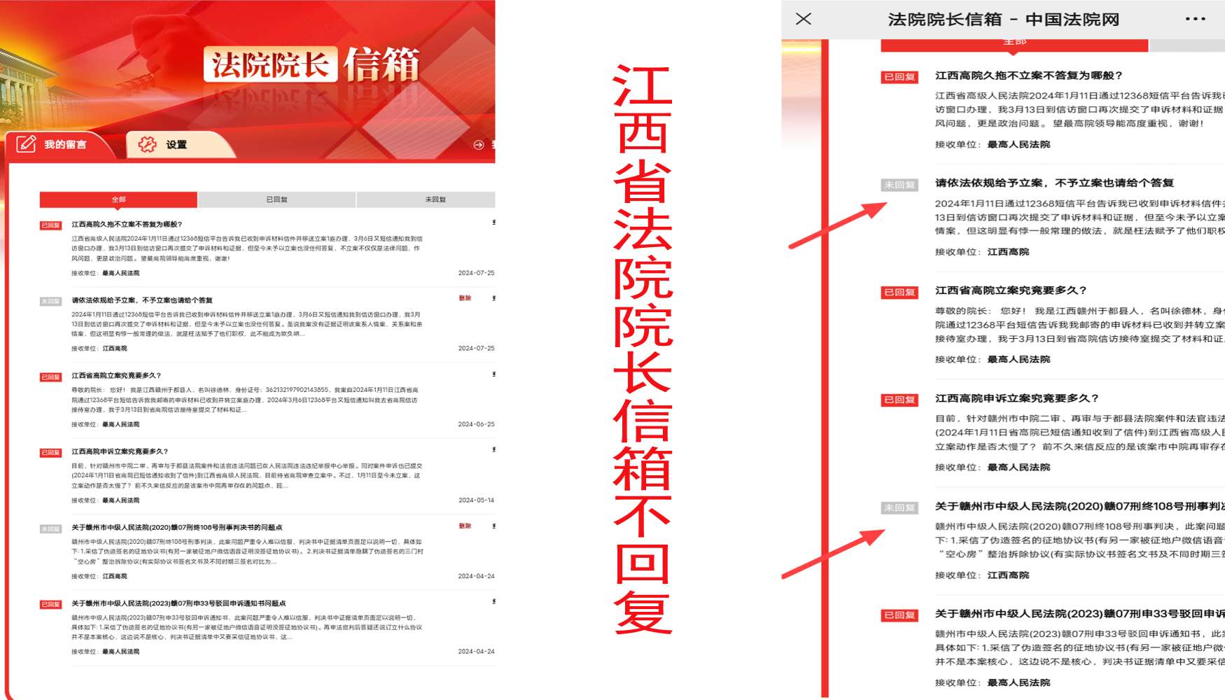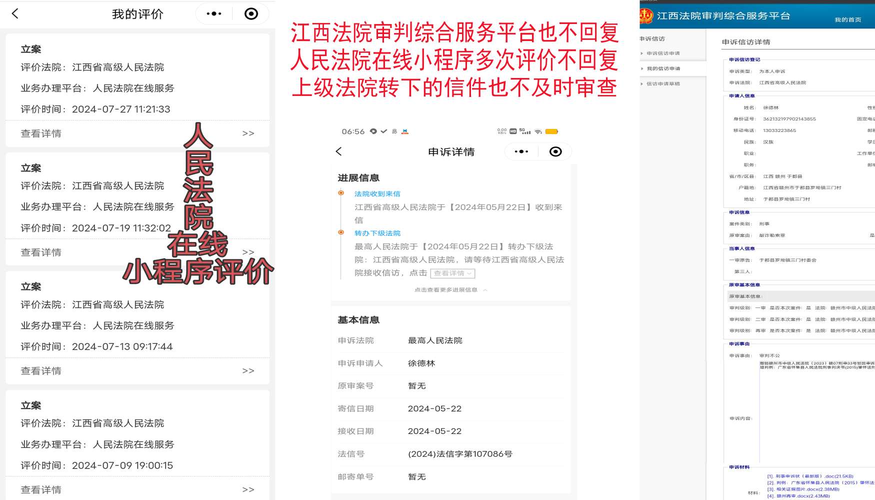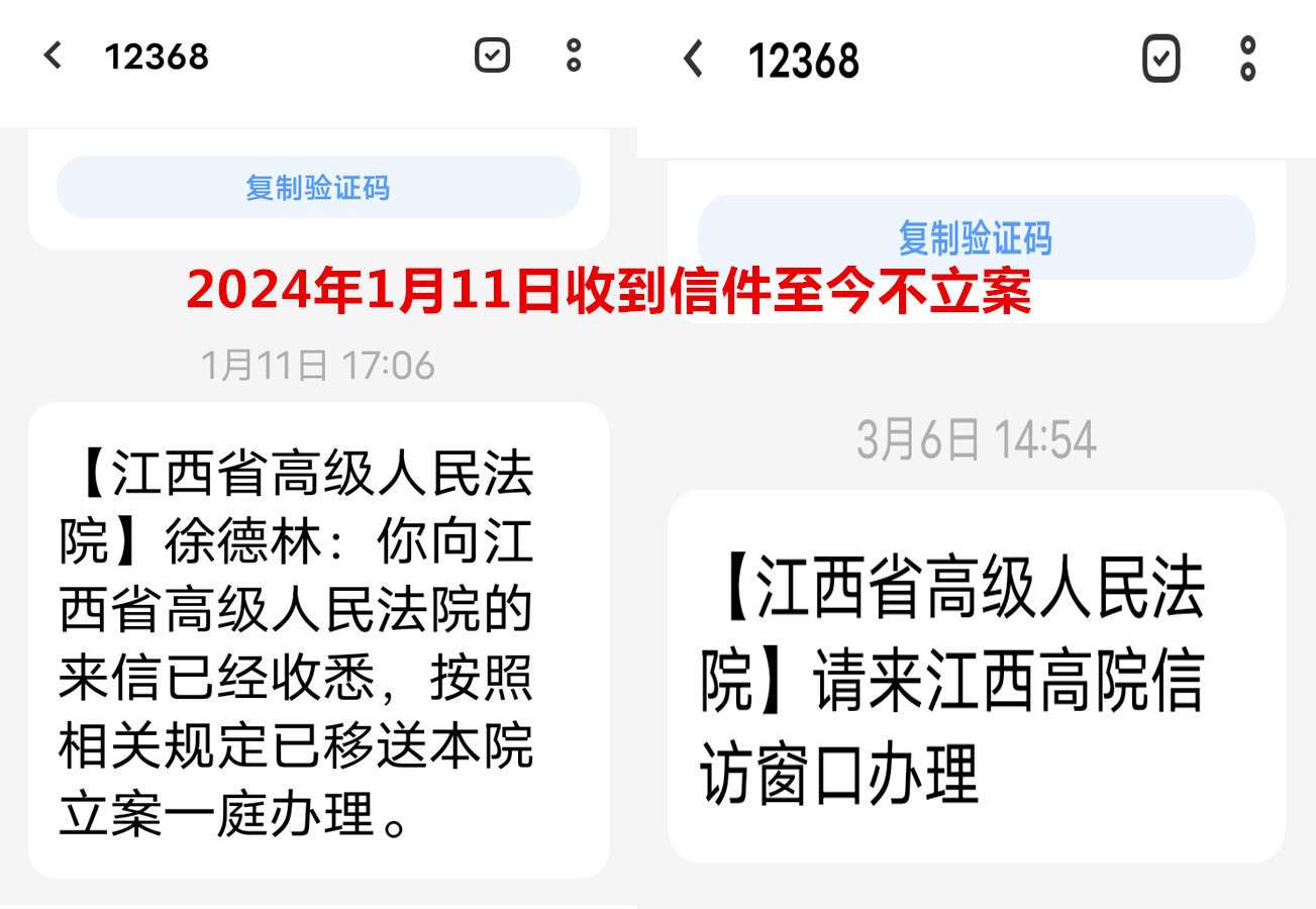 事情经过:江西省高级人民法院于2024年1月11日通过12368短信平台告诉我已收到申诉材料信件并移送立案1庭办理,同年3月6日又短信通知我到信访窗口办理,我3月13日到信访窗口再次提交了申诉材料和证据,但至今未予以立案,也没任何答复,同时院长信箱及其它网上法院平台信件也不回复。